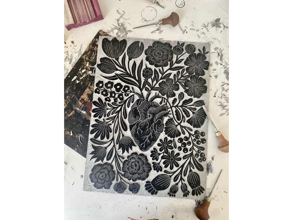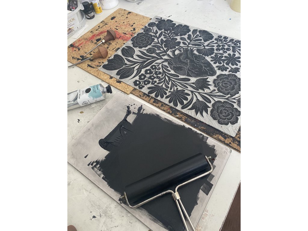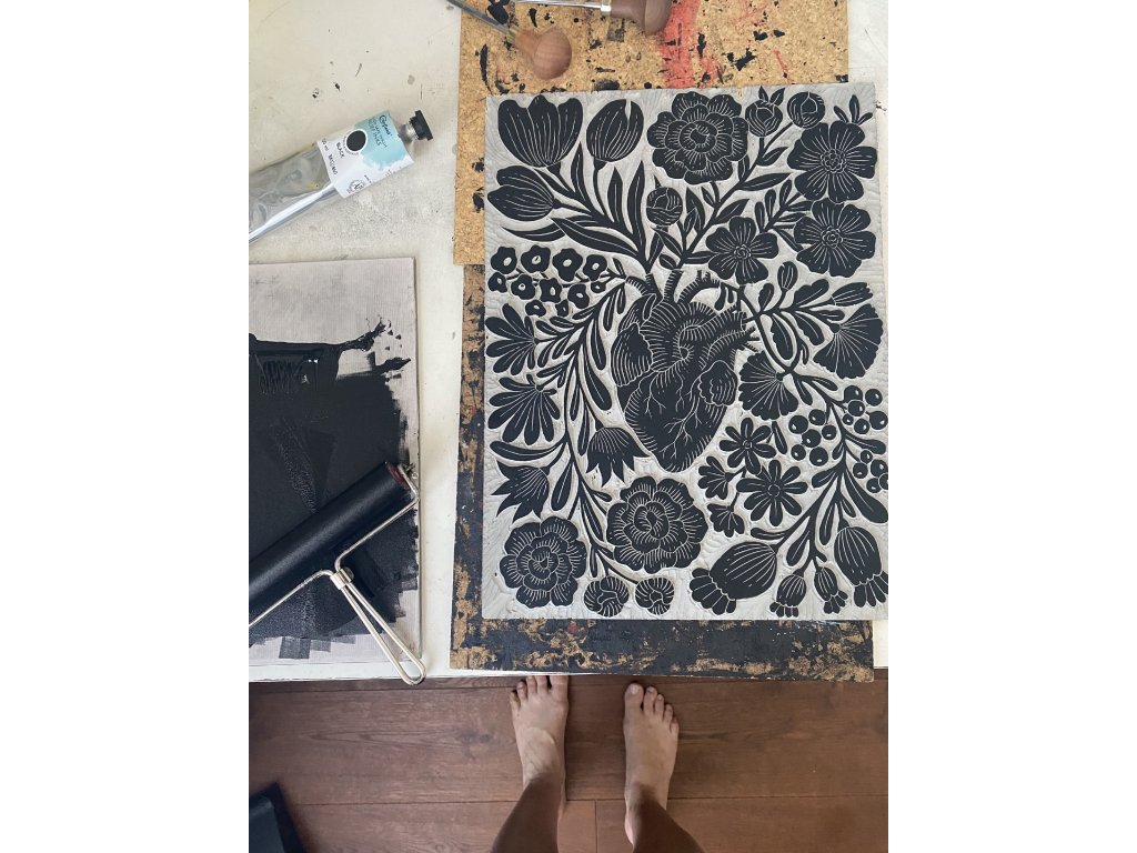 Každý tisk je originál s mírně odlišnou texturou barvy dle typu otisku z linorytové šablony. Textura otisku není "jednolitá" - vytváří nepravidelné krytí barvou což je charakteristické pro ručního zpracování.