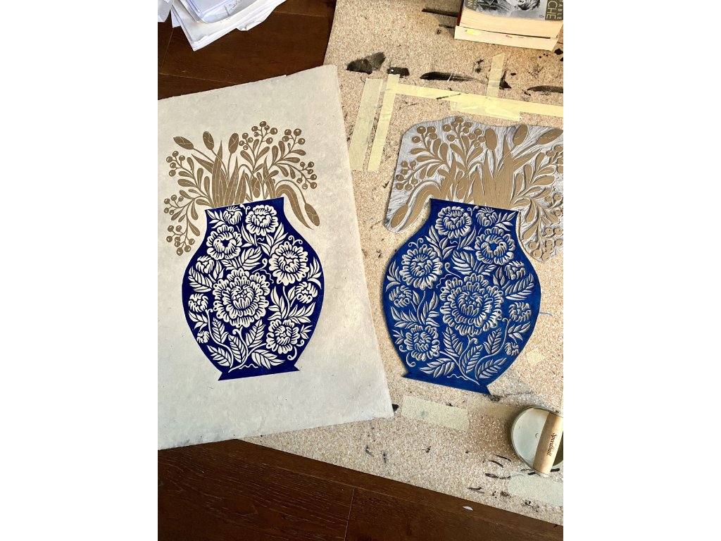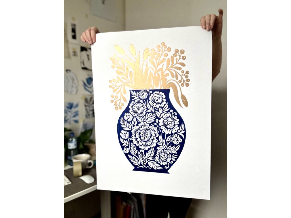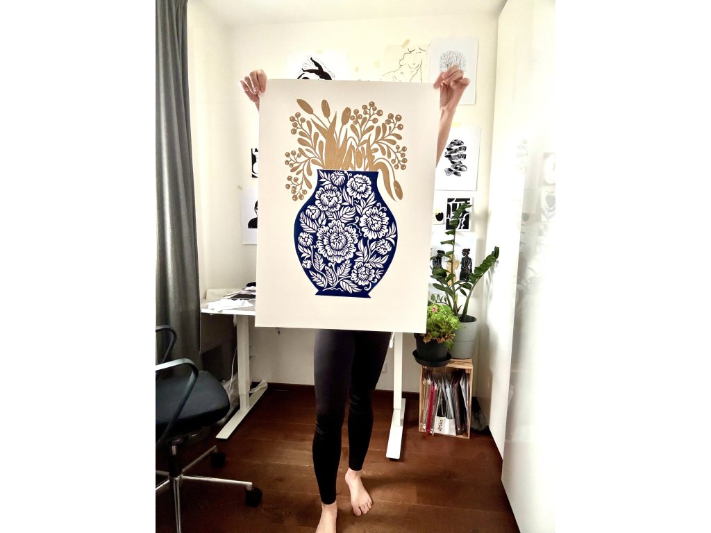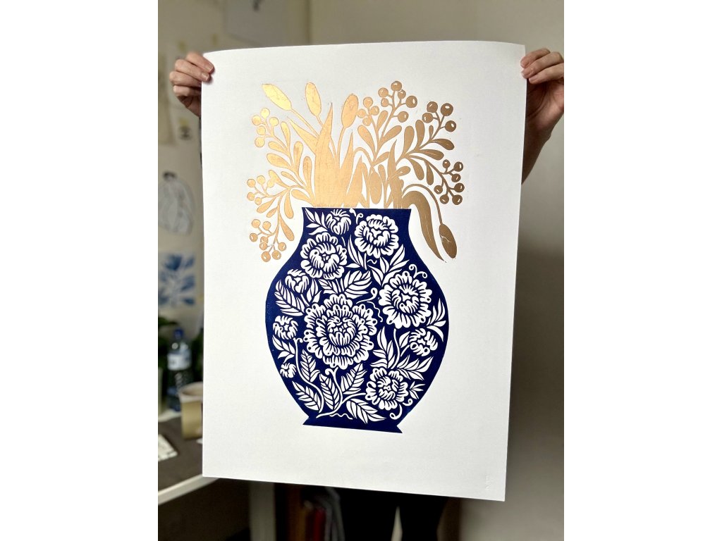 Dvoubarevný linorytový tisk: zlatý olej v kombinaci s modrým inkoustem