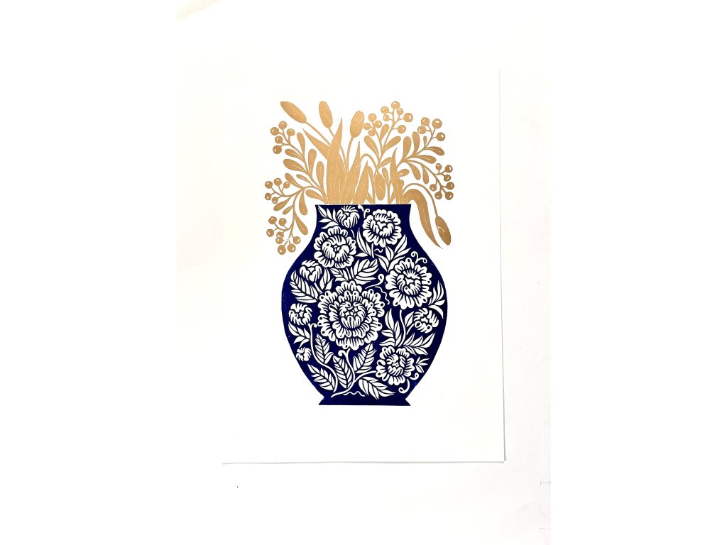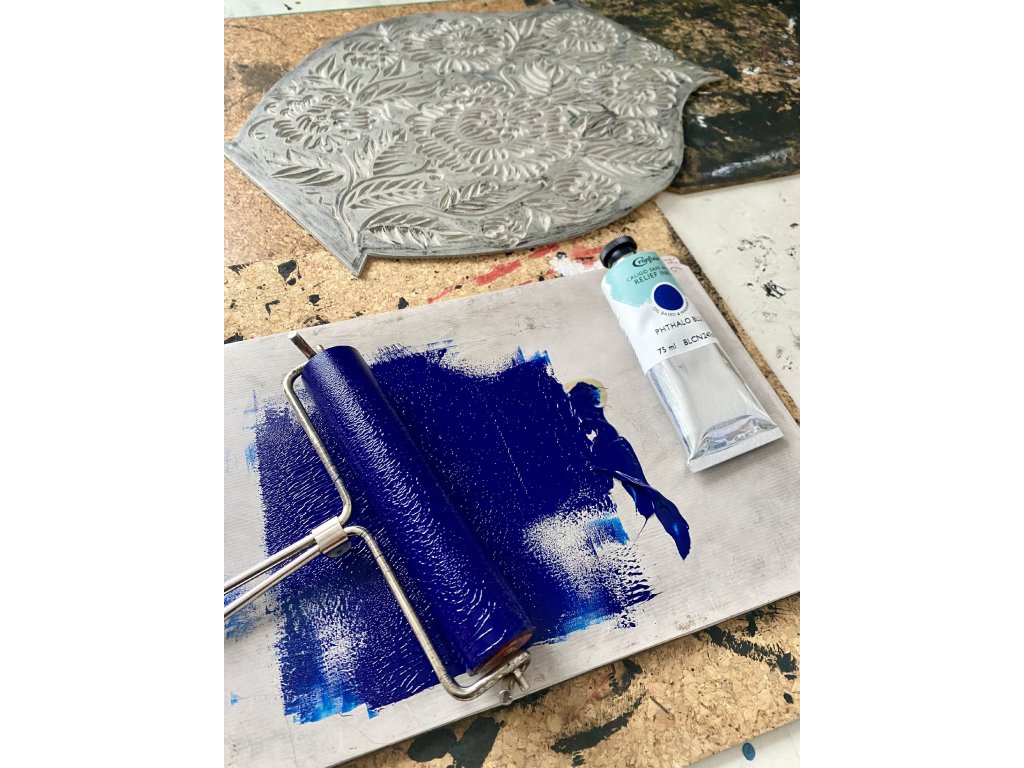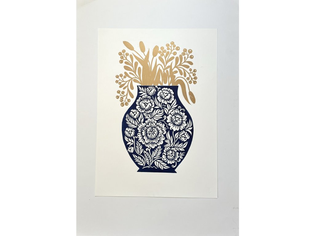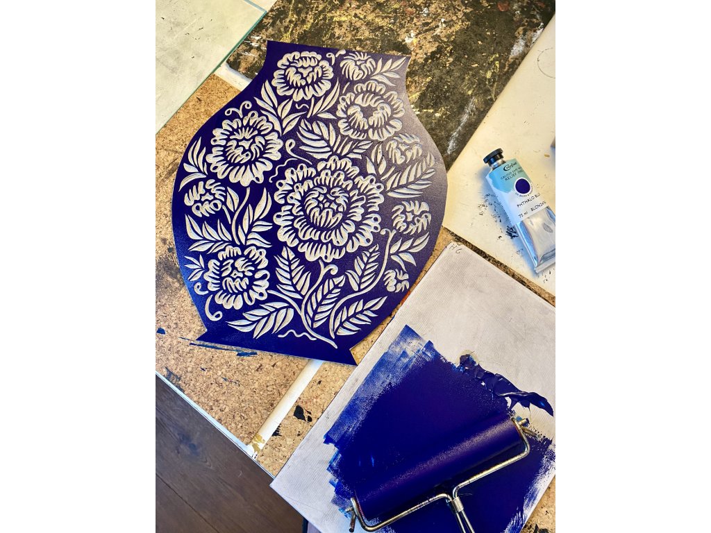 Dvoubarevný linorytový tisk: zlatý olej v kombinaci s modrým inkoustem