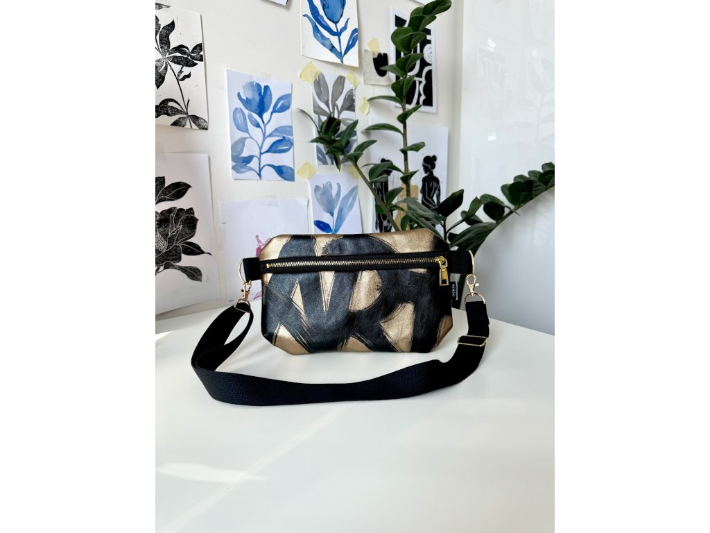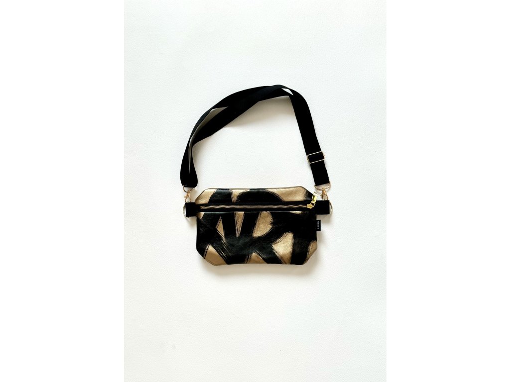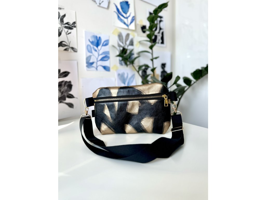 Zlatá metalická koženka s černou ruční malbou na přední straně, zlaté kování